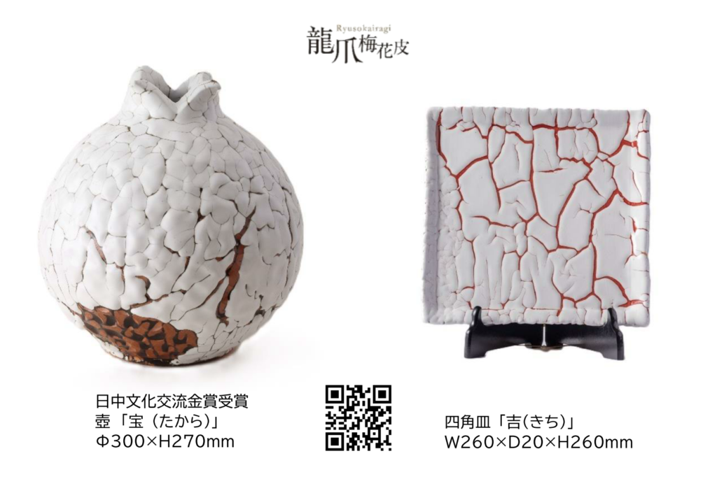 岩崎政雄が陶芸人生のすべてを注いで完成させた龍爪梅花皮は優雅な白と力強いちぢれ目(梅花皮)がおりなす奇跡の模様です。特に赤の梅花皮は日本初と称賛され、人気の陶芸品です。